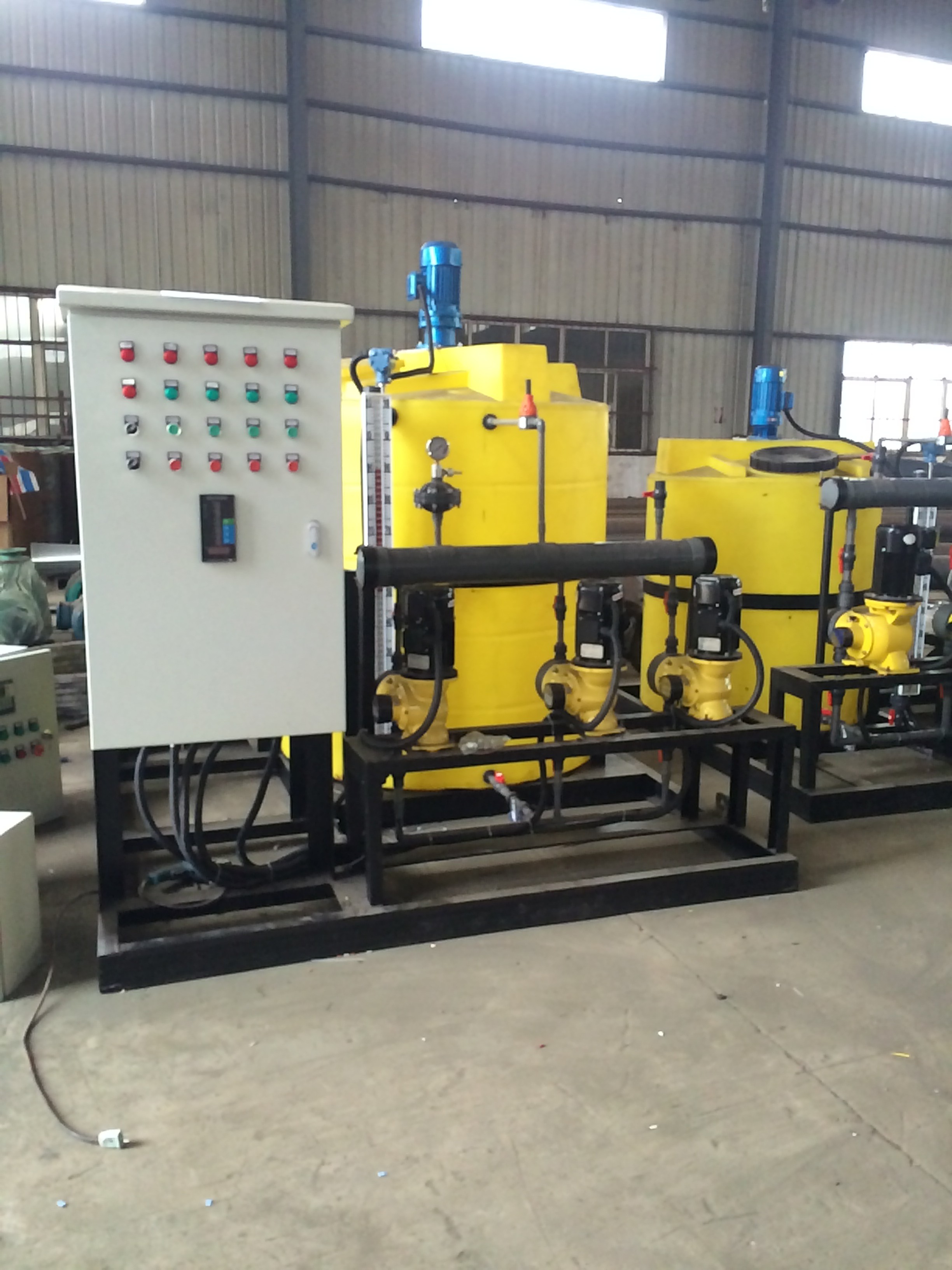 加藥裝置通過不同的工藝設(shè)計(jì),精確配置各類固體和液體的化學(xué)藥品的溶液,再用計(jì)量泵準(zhǔn)確投加,以達(dá)到各種設(shè)計(jì)要求。如除垢、除氧、混凝、加酸、加堿等。